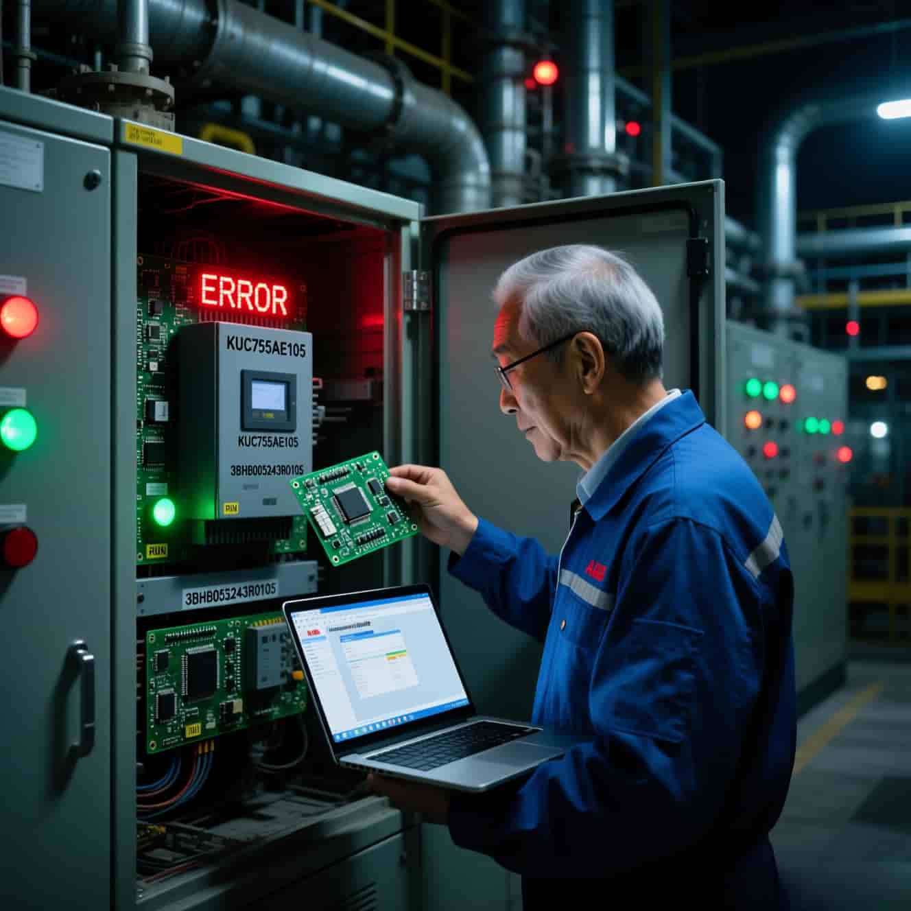 شیائو لی پس از رعایت دقیق رویههای ایمنی LOTO و تأیید خاموش بودن کامل سیستم، کابینت کنترل را باز کرد. او متوجه شد که چراغ سبز RUN در KUC755AE105 روشن نیست، در حالی که چراغ قرمز ERRO چشمک می زند. او بر اساس سالها تجربهاش، قضاوت کرد که گهگاه خرابی در تراشه ارتباطی یا سیستم عامل برد کنترل وجود دارد.