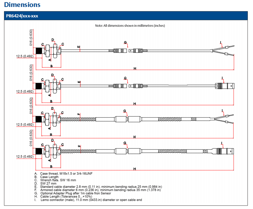 PR6424/011-040 یک سنسور جریان گردابی (پروب) با قطر 16 میلی متر است. کد دستوری "011-040" نشان می دهد که این پیکربندی از رزوه M18x1.5 استفاده می کند، کابل زره دار ندارد، دارای طول محفظه 50 میلی متر، طول کل کابل 10 متر و مجهز به کانکتورهای LEMO است.