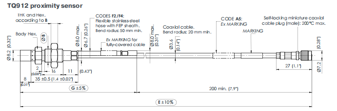 TQ912 111-912-000-01X-A1-B1-E5000-F0-G0-H05 برای کاربردهای معکوس طراحی شده است. اجسام سنسور با موضوعات متریک یا امپریال در دسترس هستند و دارای یک کابل کواکسیال انتگرال با یک کانکتور کواکسیال مینیاتوری خود قفل شده است.