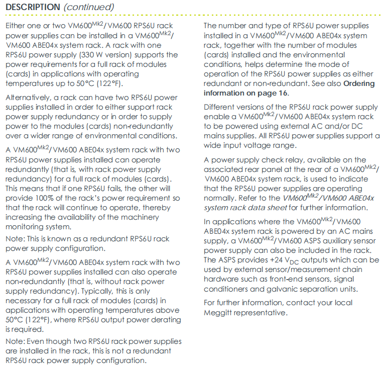 RPS6U یک ماژول برق اختصاصی با ارتفاع 6U است که توسط Megite Sensing Systems برای نظارت بر وضعیت VM600 Mk2 / VM600 و پلت فرم سیستم حفاظت مکانیکی طراحی شده است. RPS6U 200-582-993-NHH مسئول ارائه توان کار DC پایدار، قابل اعتماد و اضافی برای تمام کارت های پردازش، کارت های I/O و کارت های ارتباطی در کل رک VM600 است. مدل 200-582-993-NHH به طور خاص به "نسخه ورودی DC" منبع تغذیه RPS6U اشاره دارد و پنل عقب آن دارای یک پیکربندی خاص است: شماره سفارش (PNR): 200-582-993-NHH